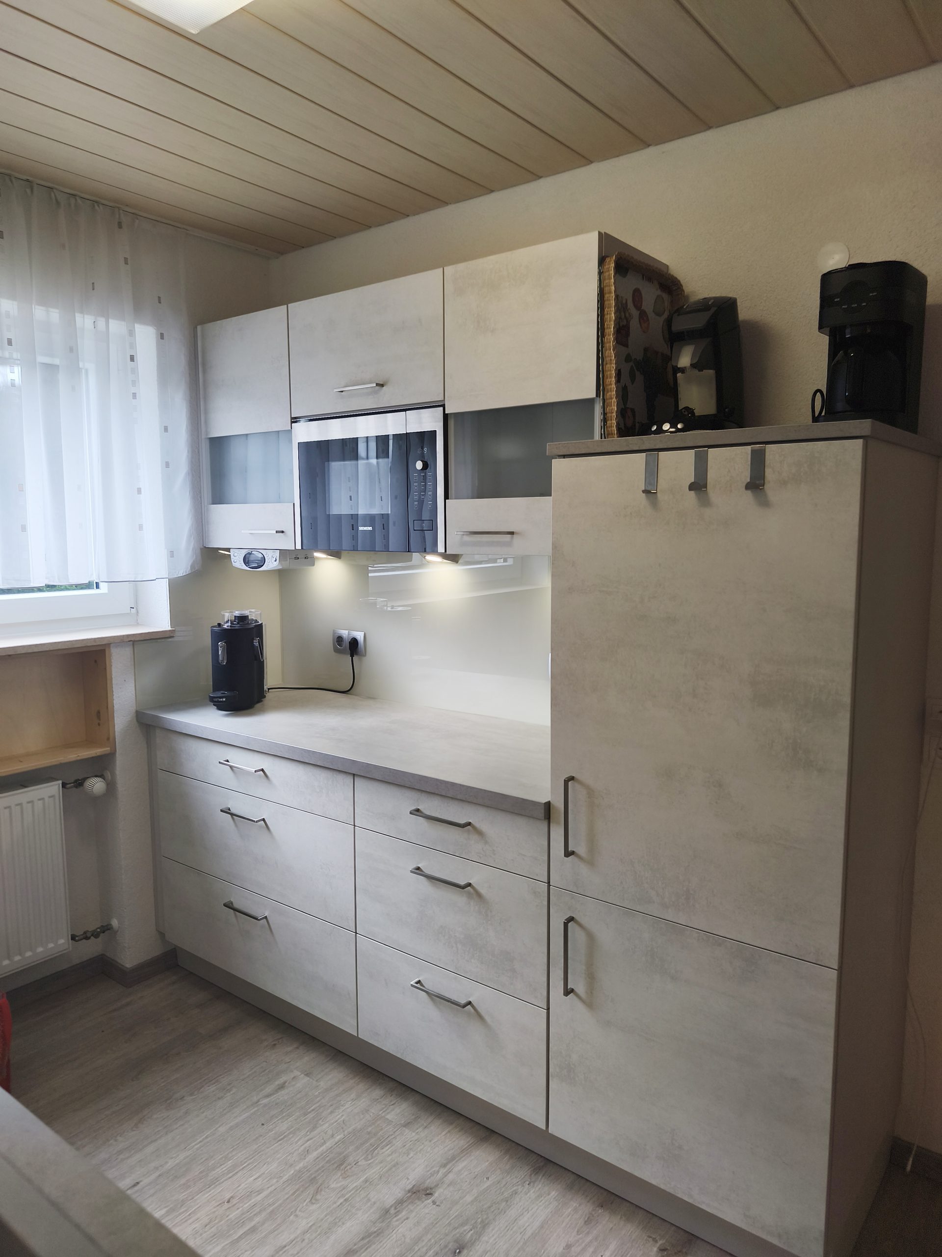 Vollständig ausgestattete Einbauküche mit Ceran-Kochfeld und Backofen, Geschirrspülmaschine, Mikrowelle, Toaster, Eierkocher, Wasserkocher,