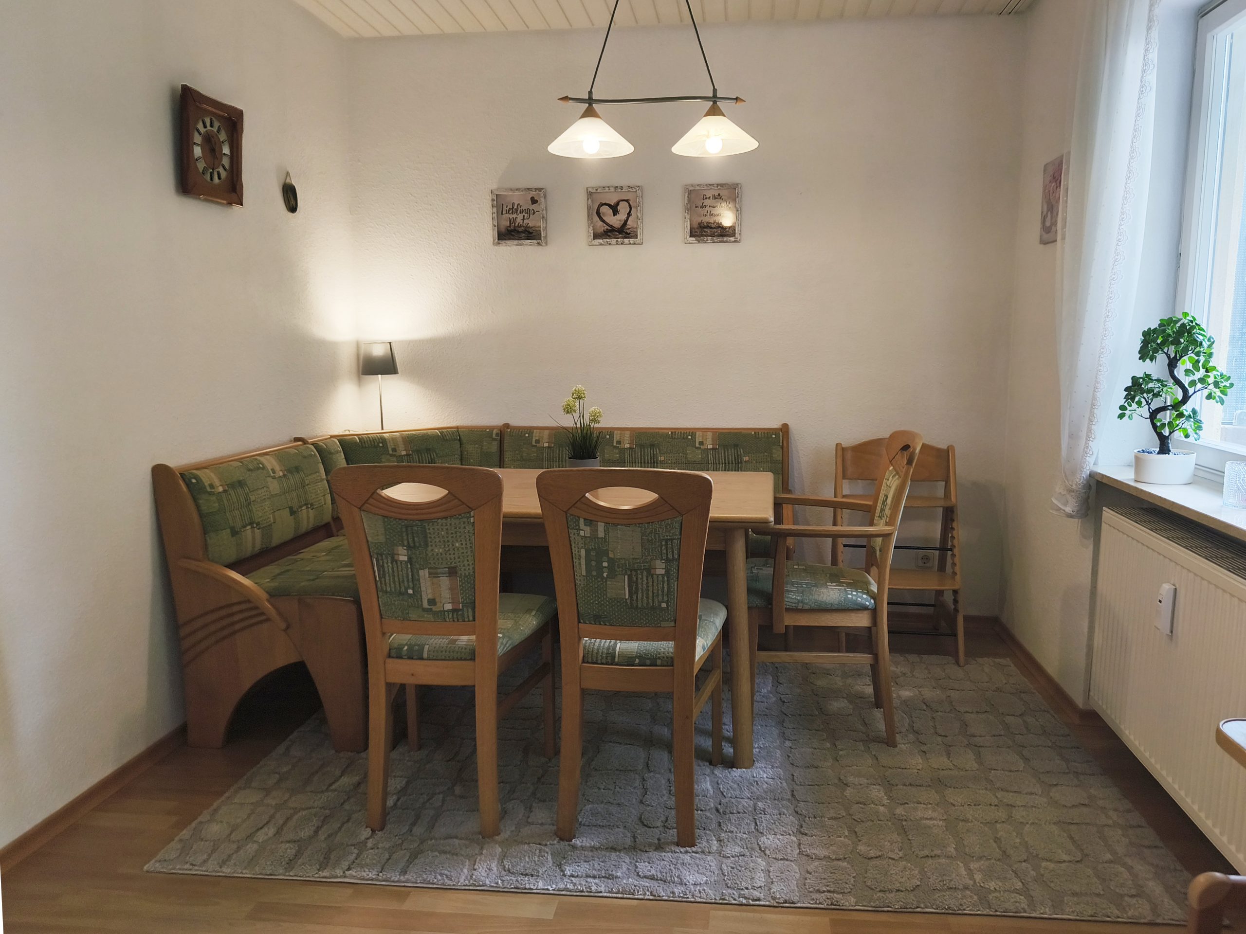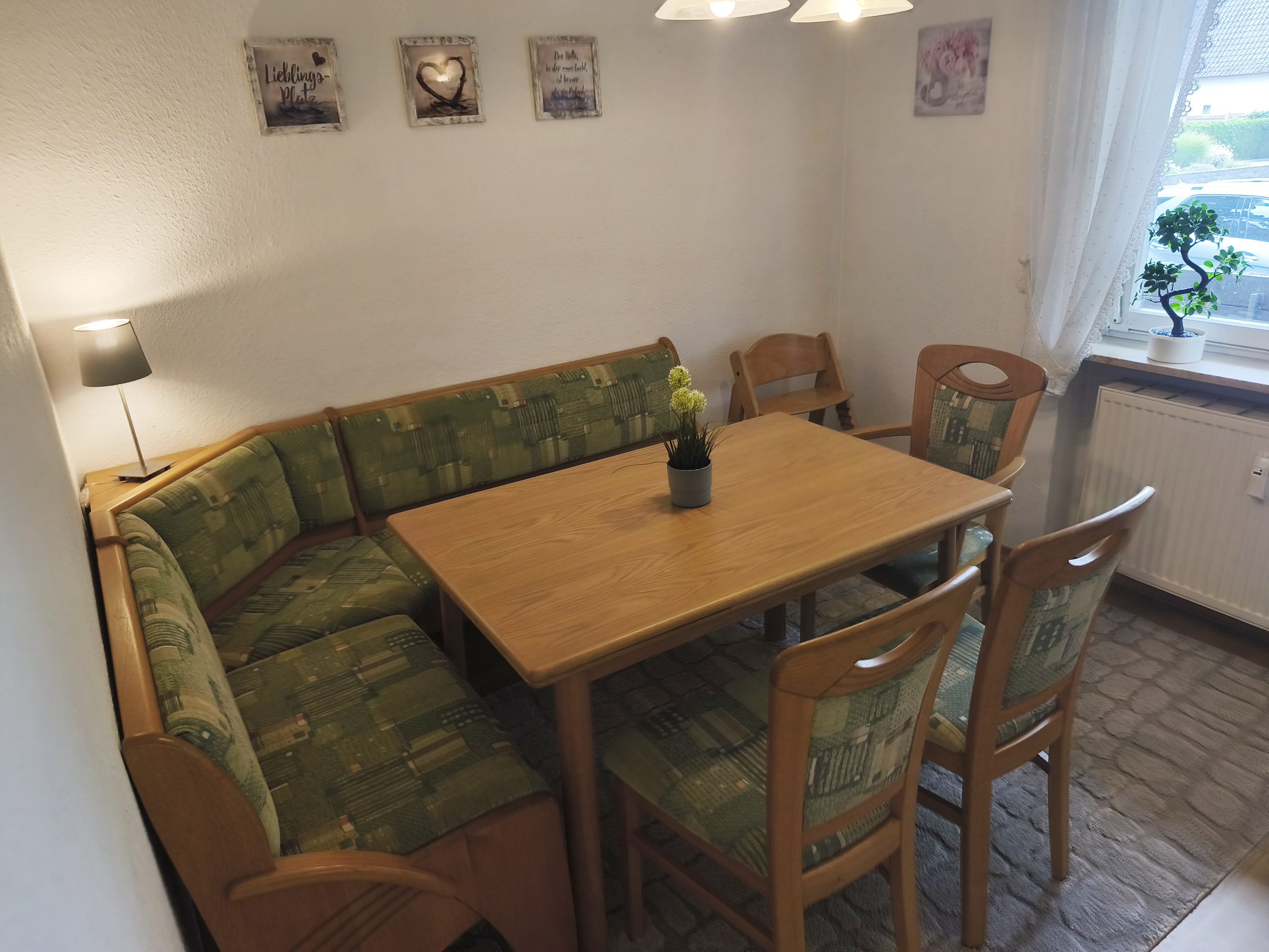 mit Eckgarnitur und 3 Stühlen. Wir halten auch 2 Kinderhochstühle für Sie bereit